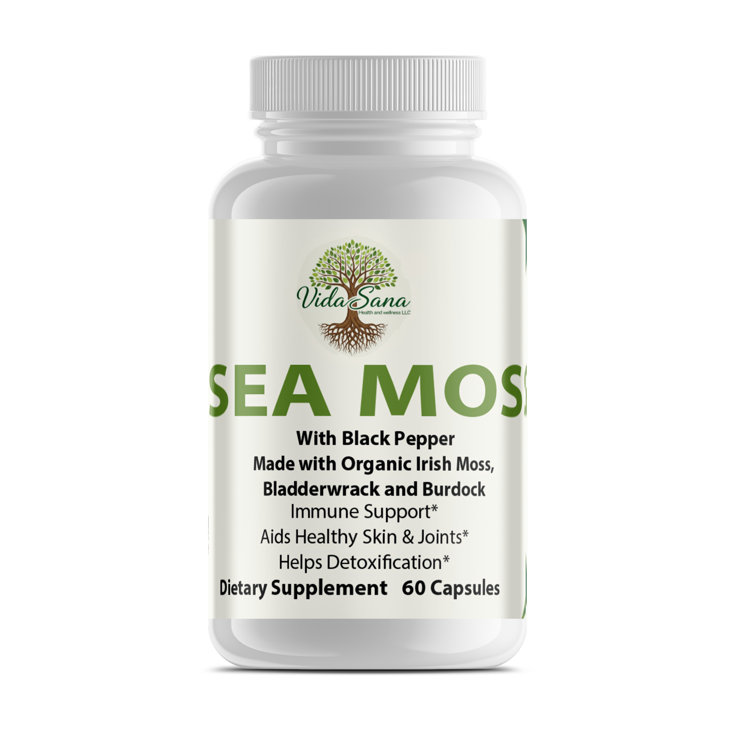 Irish Sea Moss capsules are formulated to support cardiovascular health, blood sugar regulation, cognitive function, detoxification, increased energy, gut health, and reduced inflammation.