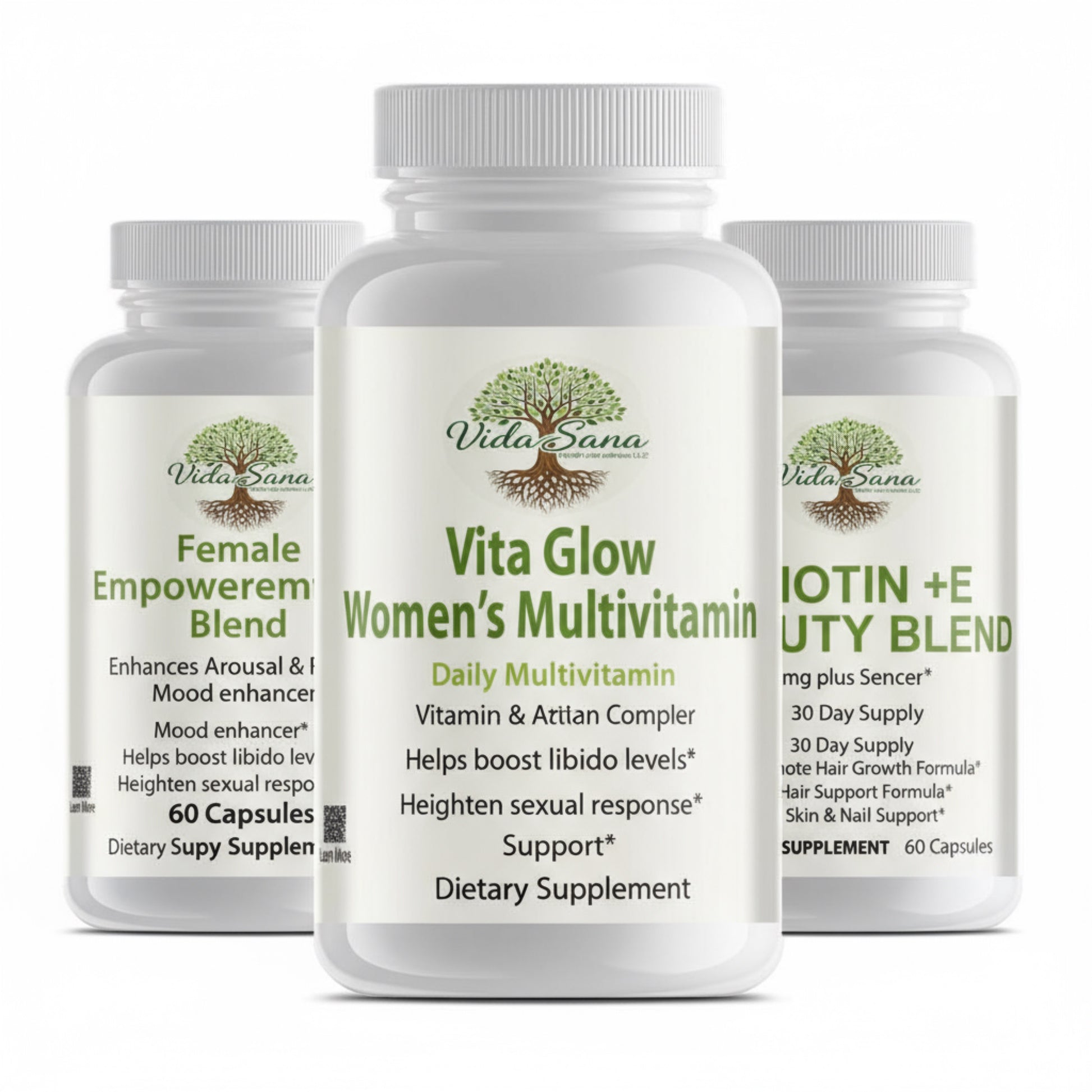 EmpowerHER Wellness Trio is a thoughtfully crafted bundle designed to support women’s overall vitality, health, and confidence. This trio combines essential multivitamins, beauty-boosting nutrients, and mood-enhancing blends to nourish the body inside and out. Whether aiming to enhance energy levels, strengthen hair and skin, or support emotional well-being, EmpowerHER Wellness Trio empowers women to feel their best every day. Experience balanced wellness tailored just for her.